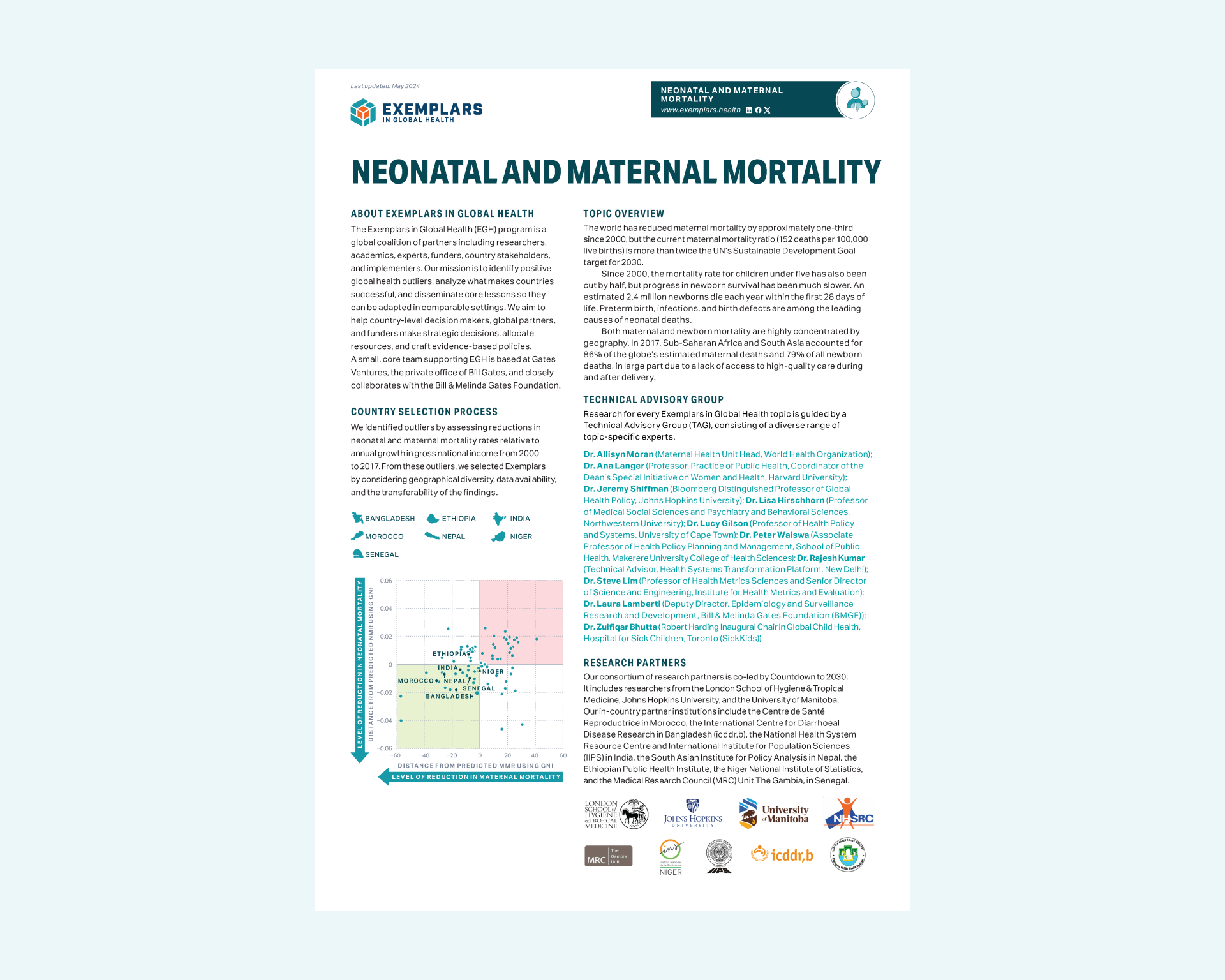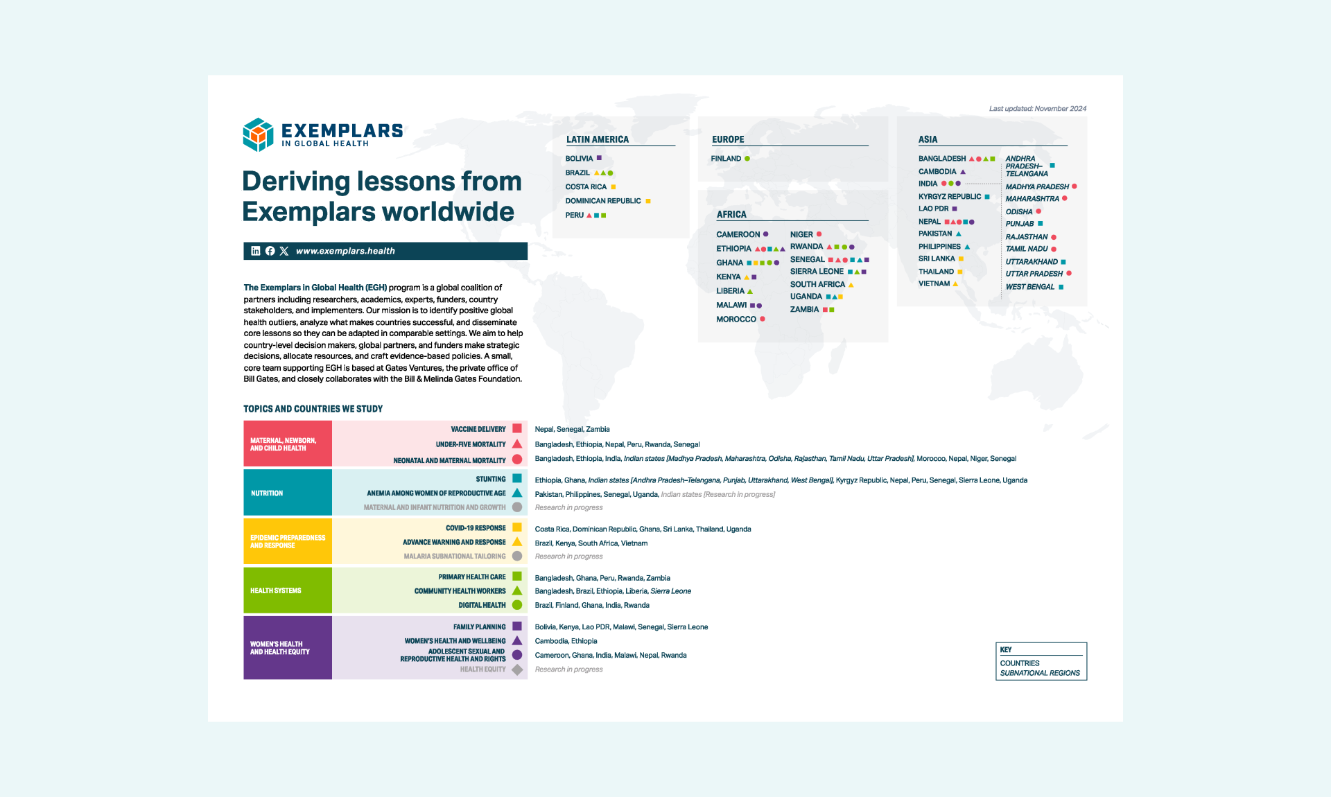 Exemplars in Global Health (EGH) is a resource for global health decision makers and was launched as an initiative under the Bill & Melinda Gates Foundation. This initiative identifies, analyzes, and shares successful health interventions and programs from around the world to improve global health outcomes. The initiative is aimed at understanding how certain countries or regions have achieved remarkable success in addressing specific health challenges, and it works to identify key lessons that can be applied elsewhere.